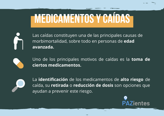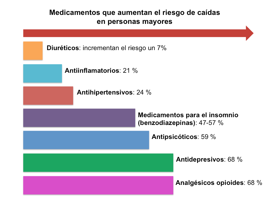 Las caídas tienen un origen multifactorial que incluye alteraciones de la movilidad y el equilibrio, factores del entorno y el uso de determinados medicamentos. Hay muchos medicamentos que pueden aumentar el riesgo de caída, aunque los psicofármacos son los medicamentos que se han relacionado a un mayor riesgo: